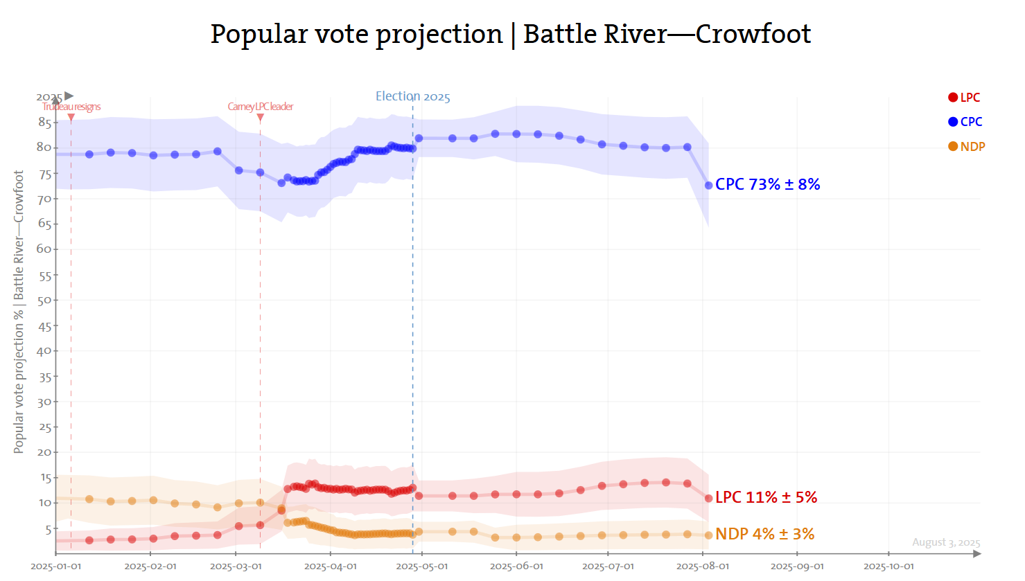 According to 388canada, from July 27 to August 3, CPC support dropped 7 from 80% to 73%. Liberals are down 4 to 11%, NDP are stable at 4%. Who got these votes? Not shown in the graph, but Independent went up 11%. I think most of that has gone to the Independent, Bonnie Critchley. I’ve followed her for a bit, she sounds like a good alternative for the riding - she even got money from me, an NDP supporter in Ontario. Check her out. Maybe some of those Conservative votes also trickled down to the other 200+ candidates on the ballot - we’ll see after the votes are counted.