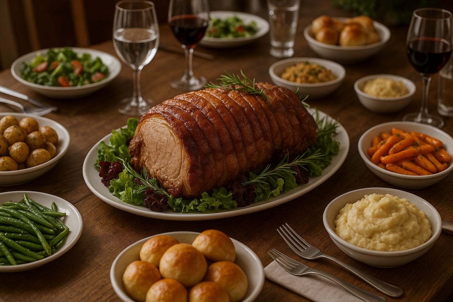 They joined Red and Bruce and followed the small crowd into the dining room. There was a huge buffet table, groaning under the weight of bowls of salads, cakes and pies, flagons of ale, and in the middle - a pile of golden glazed roast meat. Red picked up a plate, then paled and pulled at the witch’s arm.